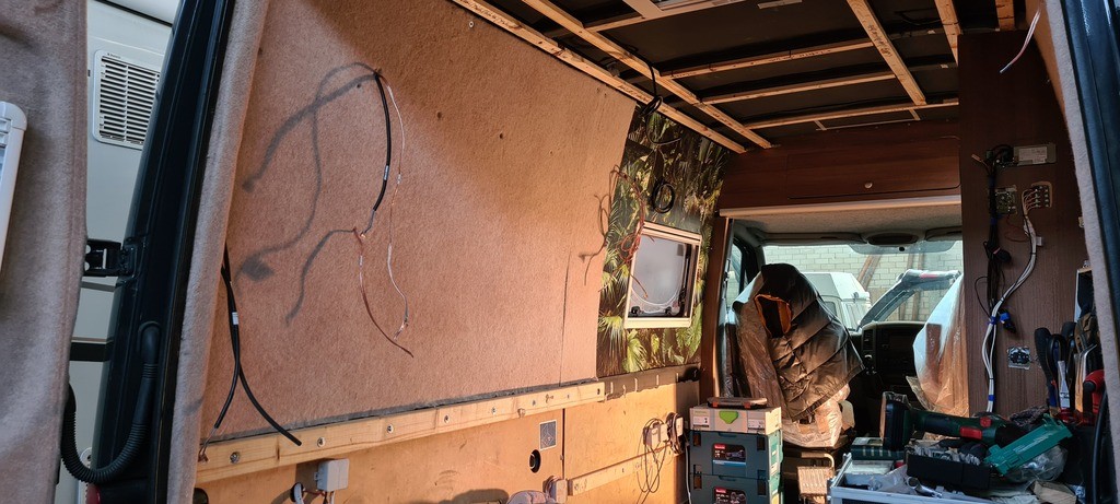 Zusätzlich dämme ich auch die bespannten Deckenplatten auf der Oberseite mit dünner Dampfsperrfolie (Alu/Styrophor) die ich einfach von oben drauf klebe. So ist auch der Himmel noch zusätzlich etwas gedämmt. Das Endergebnis kann sich sehen lassen. Wieder ein Punkt auf der Liste abgehakt. Decke und Wände – Check!